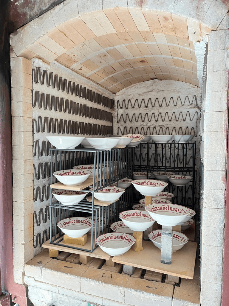 หลังจากติดลวดลายลงบนชิ้นงานเซรามิก เรานำผลงานเข้าสู่กระบวนการเผาไฟที่อุณหภูมิสูงกว่า 850°C โดยใช้เทคนิคเฉพาะที่ควบคุมทั้งอุณหภูมิ เวลา และการไหลเวียนของความร้อนอย่างแม่นยำ